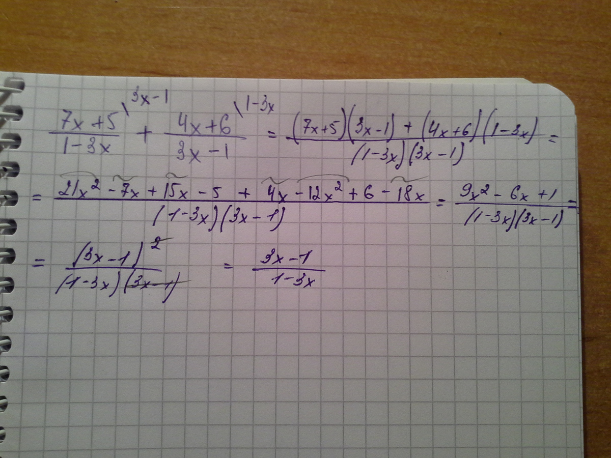 (7x+5)/(1-3x) + (4x+6)/(3x-1) = (ко второй дроби дополнительный множитель -1) = (7x+5-4x-6)/(1-3x) = (3x-1)/(1-3x)= -1(1-3x)/(1-3x)=-1