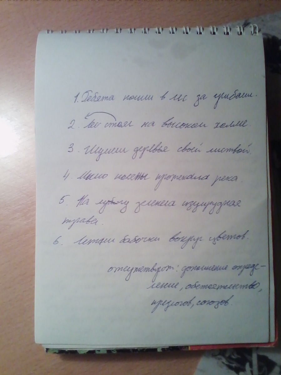 прочитай предложения.Подумай,какие члены предложения отсутствуют.Дополни предложения второстепенными членами и запиши их.1.Ребята пошли.2.Стоял лес.3.Шумели деревья.4.Протекала река.5.Зеленела трава.6.Летали бабочки.