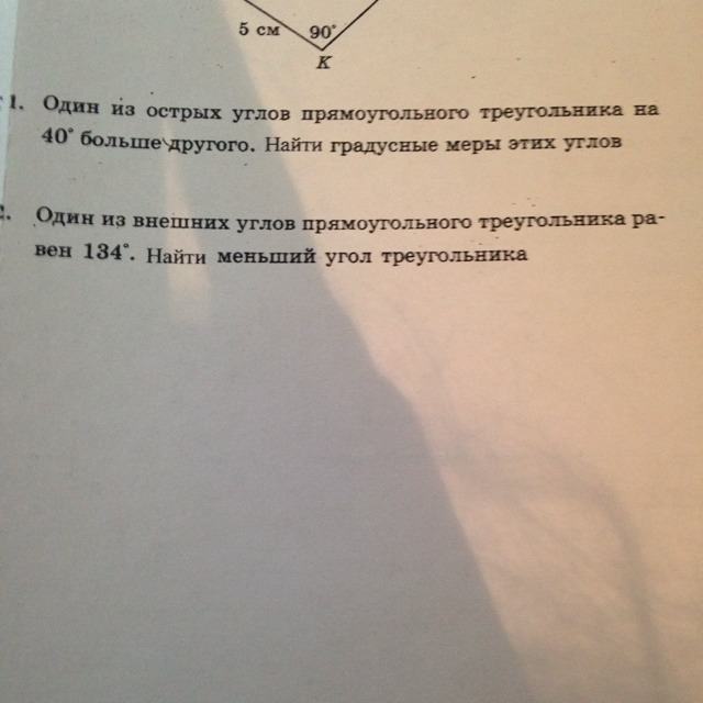 2. Т.к. один из углов равен 90 гр., то один из острых будет равен 134-90=44 гр.