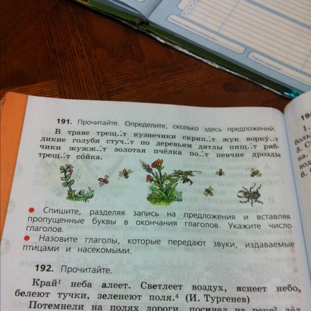 В траве трещат кузнечики. Скрипит жук. Воркуют дикие голуби. Стучат по деревьям дятлы. Пищат рябчики. Жужжит золотая пчелка. Поют певчие дрозды. Пищит сойка.
