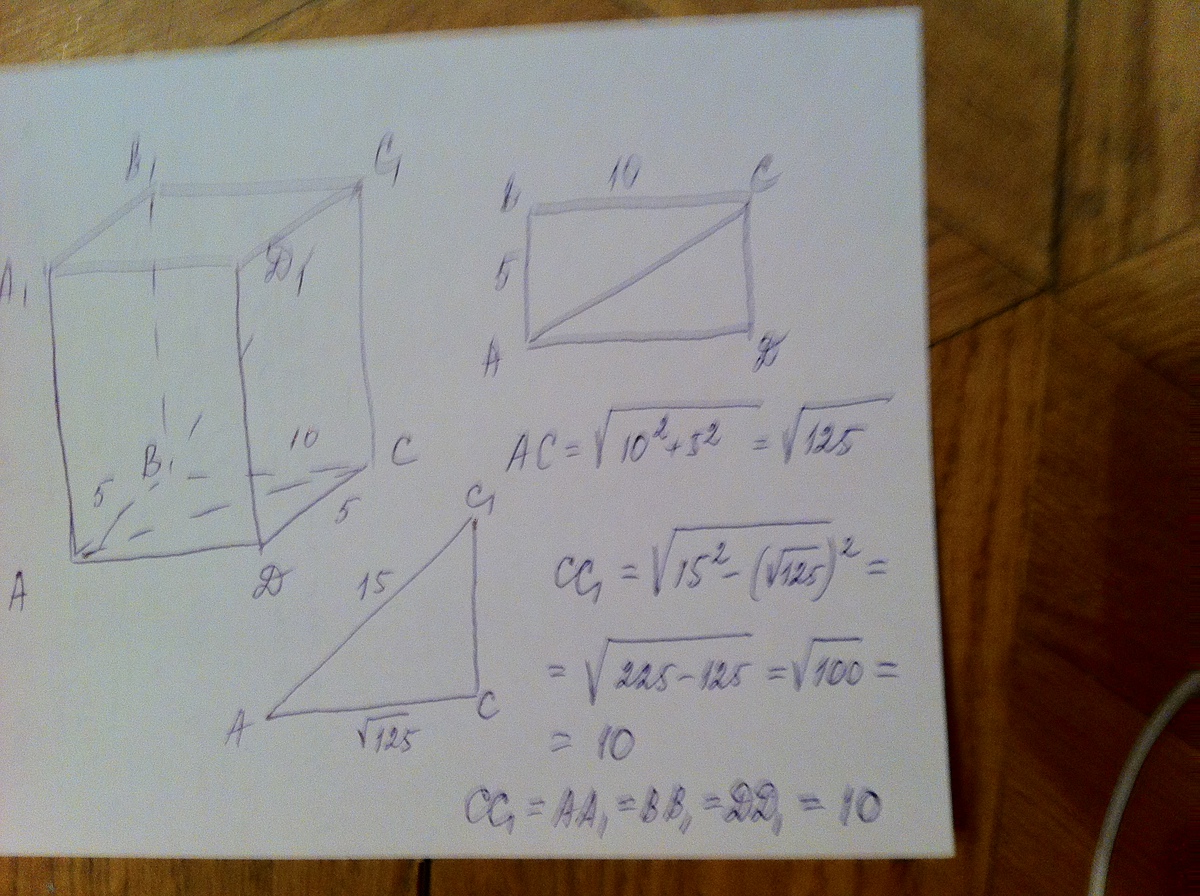 в прямоугольном параллелепипеде ABCDA1B1C1D1 известно что AC1=15, AB=5, ВС=10. Найти длину ребра ВВ1. если можно с рисунком))