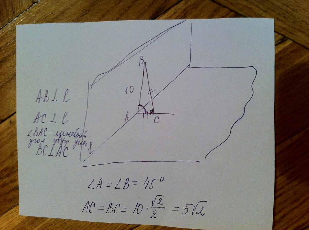 Величина линейного угла двухгранного угла равна 45 градусов. Найдите расстояние от точки А, расположенной на одной грани, до другой грани, если расстояние от этой точки до ребра двухгранного угла равно 10 см