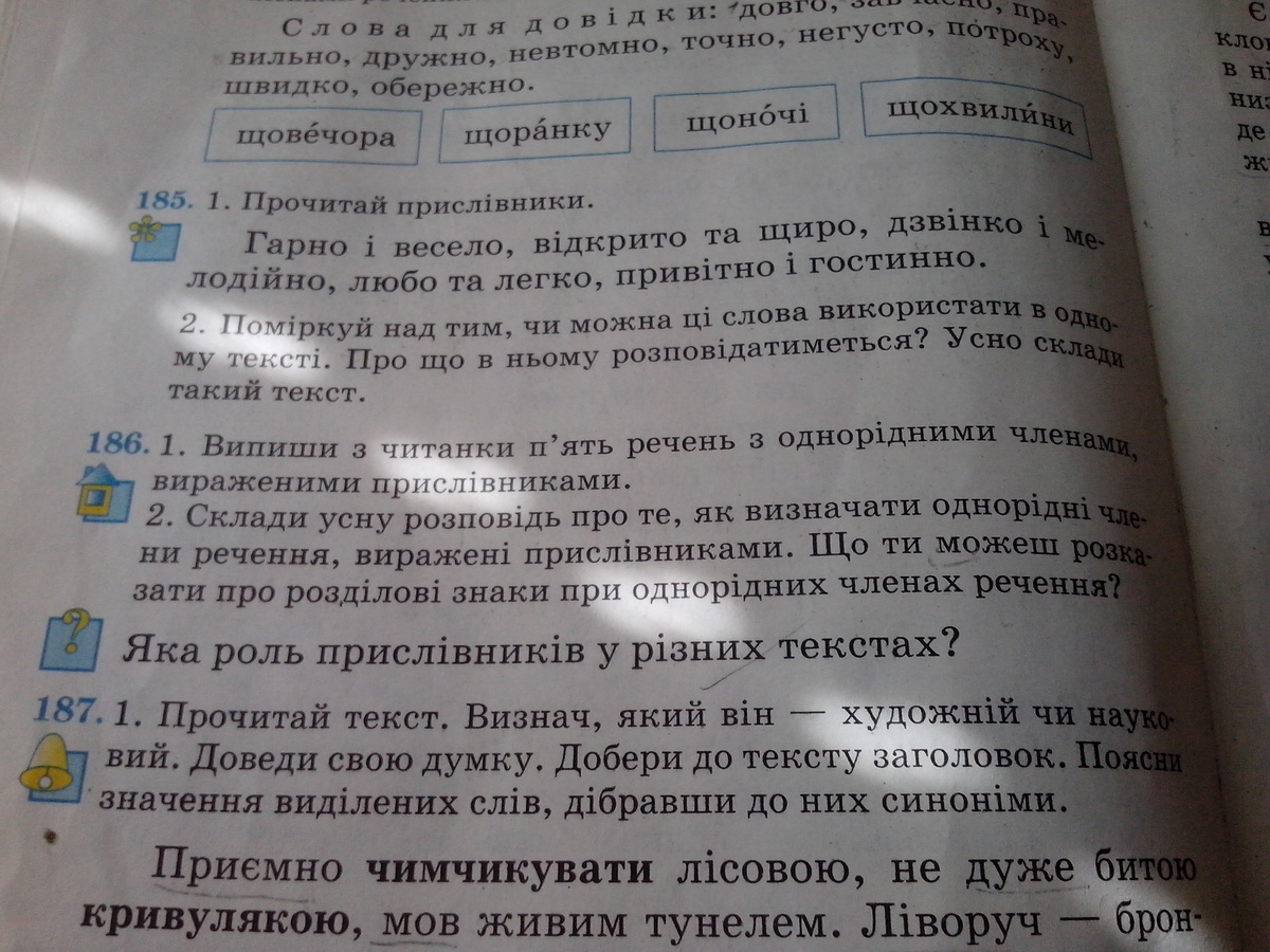 На полянах лісових,на стрімких високих,на просторах степових.По долині жито,по горі блакить.Угорі-надворі.На паркані,на дротах.На небі,на долоні.