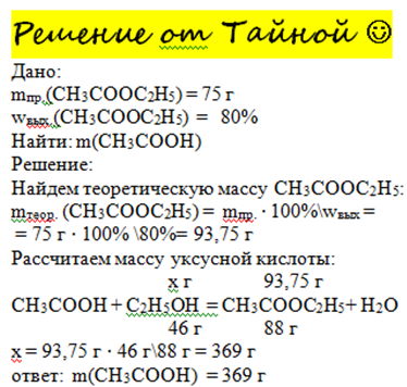 Какую массу этилового спирта нужно взять, чтобы получить уксусноэтиловый эфир массой 75 г, если массовая доля выхода продукта составляет 80%?