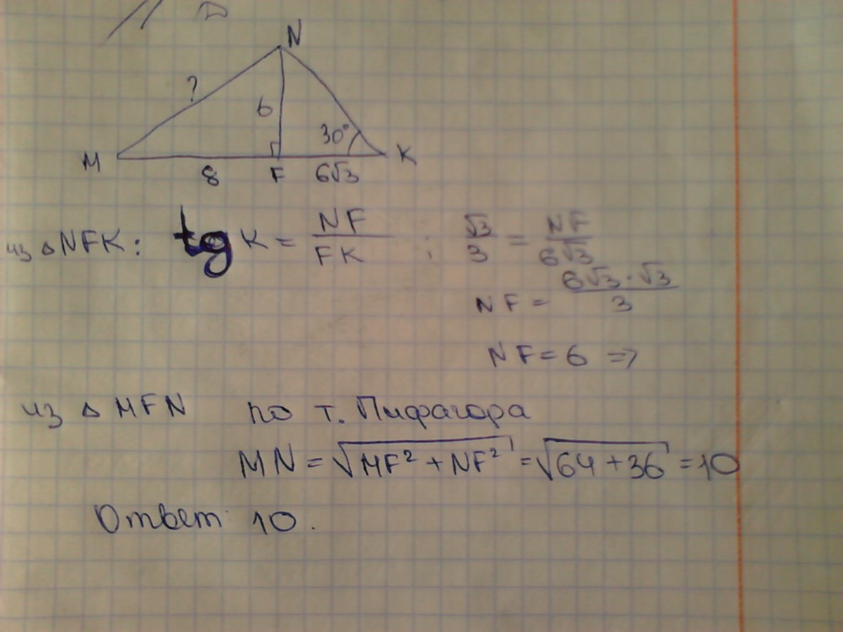 Высота NF треугольника MNK делит его сторону МК на отрезки MF и FK. Найдите длину отрезка MN, если FK - 6 корней из-3, MF - 8 см, угол К - 30 градусов