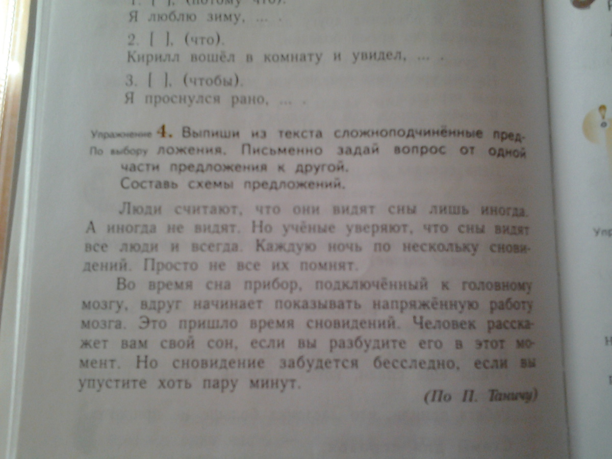 Люди считали(что?), что они видят сны лишь иногда. Но ученые уверяют(что?), что сны видят все люди и всегда. Человек расскажет вам свой сон (при каком условии?), если вы разбудите его в этот момент. Но сновидение забудется бесследно(когда?), если вы упустите хоть пару минут.