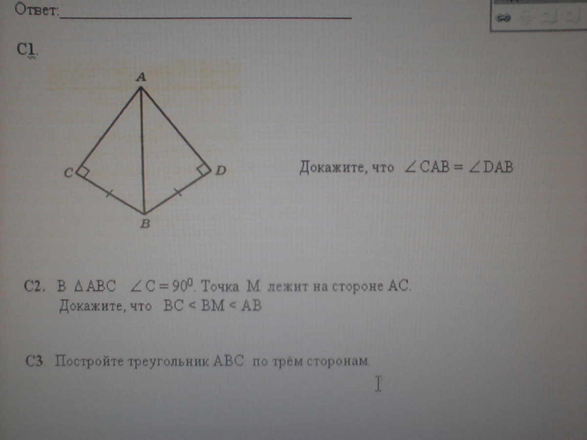 а АВ(гипотунуза)-общая, следовательно треугольники САВ И АДВ равны(по катету и гипотенузе)