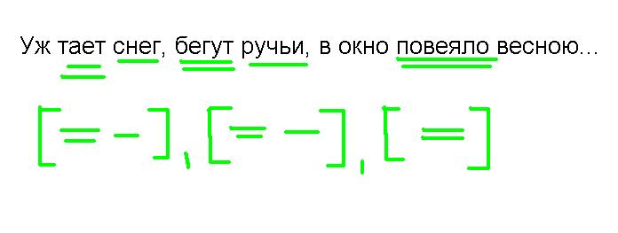 Уж тает (сказуемое, выраженное глаголом, подчёркивается двойной чертой) снег (подлежащее, выраженное существительным, подчёркивается одной чертой), бегут (сказуемое, выраженное глаголом, подчёркивается двойной чертой) ручьи (подлежащее, выраженное существительным, подчёркивается одной чертой), в окно (обстоятельство, выраженное существительным, подчёркивается пунктиром с точкой) повеяло (сказуемое, выраженное глаголом, подчёркивается двойной чертой) весною (дополнение, выраженное существительным, подчёркивается пунктиром).