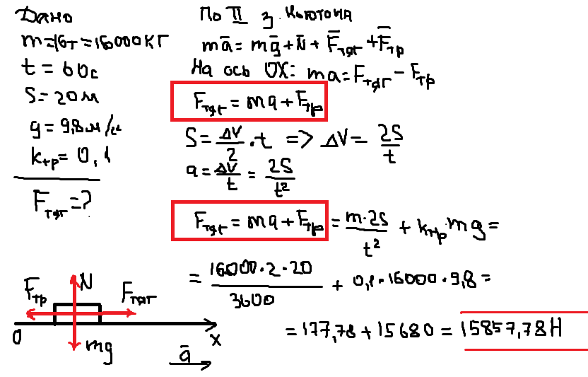 Масса неподвижного вагона m = 16 т . Рассчитайте силу тяги F , которую надо приложить к вагону, чтобы он стал двигаться равноускоренно и за время t = 60 с прошел путь s = 20 м , g = 9,8 м/с 2. На вагон действует сила тренияFтр . Коэффициент трения kтр = 0,1.Результат получите в системе СИ, округлите до двух значащих цифр после запятой. Размерность не указывать!