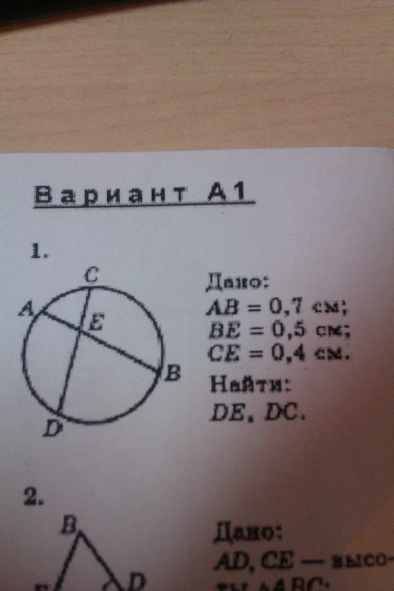 1) DE*CE=AE*BE (по теореме о произведении отрещков пересекающихся хорд)