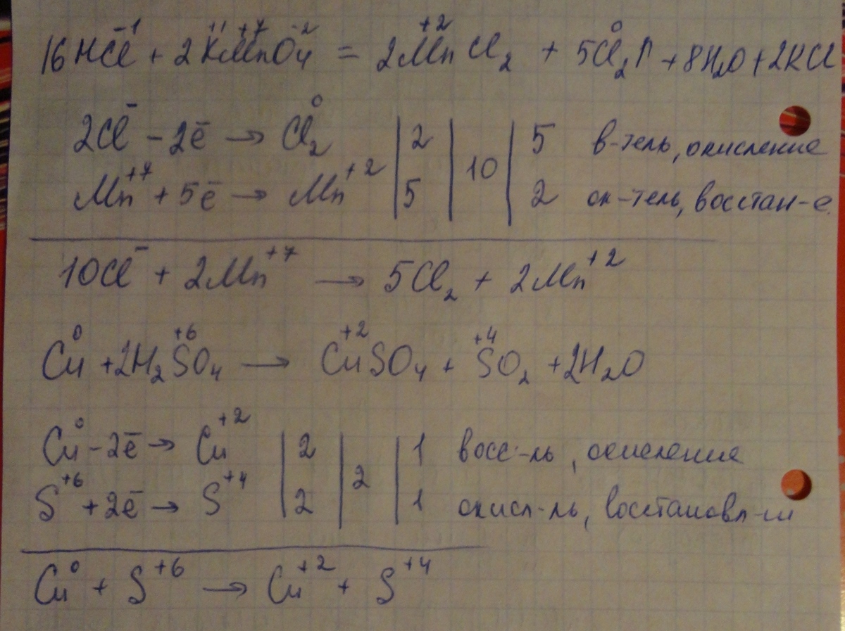 расставьте коэффициенты в схемах методом электронного баланса. Укажите окислитель и восстановитель, процессы окисления и восстановления. HCL + KMnO4 - CL + KCL + MnCL2n+ H2O Cu + H2SO4 - CuSO4 + SO2 + H2O