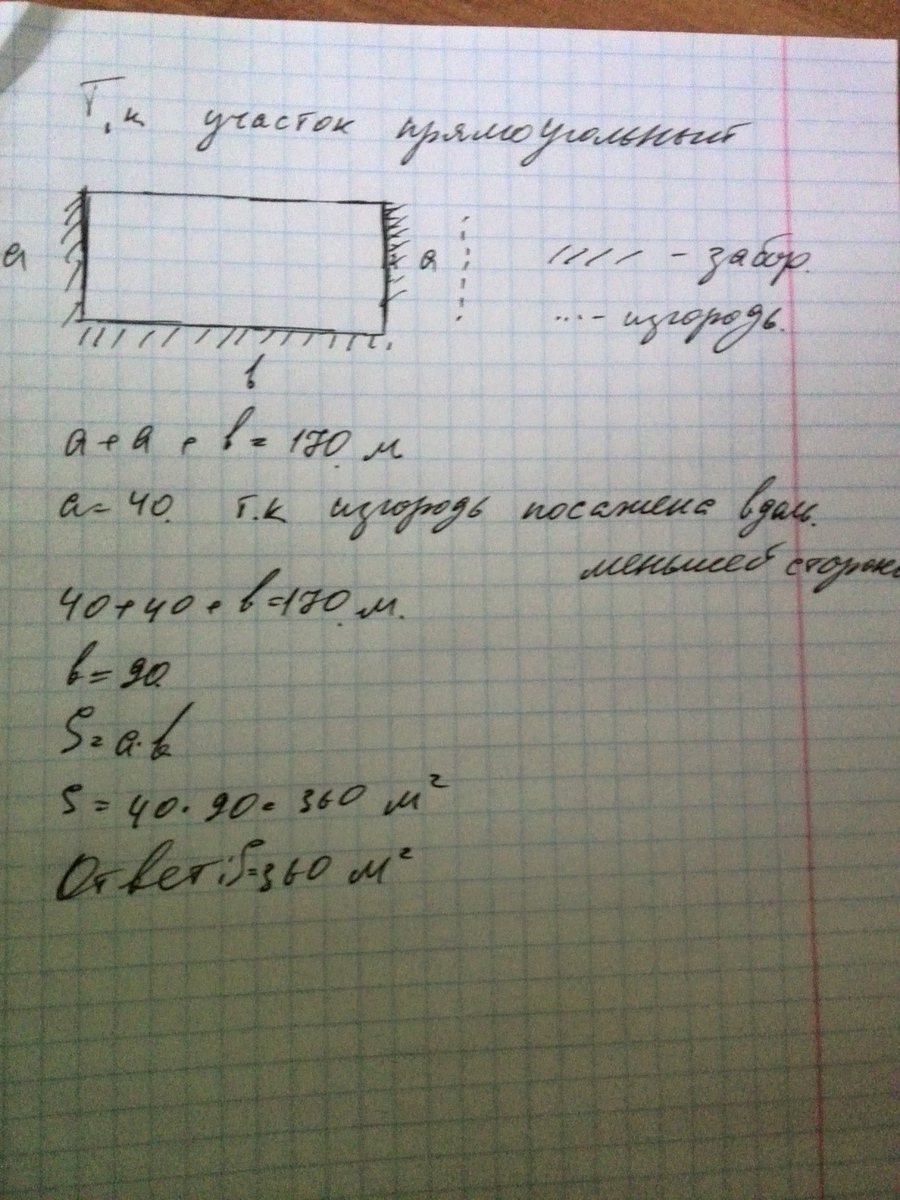 Участок прямоугольной формы с трёх сторон обнесён забором общая длина которого 170м вдоль одной из коротких сторон высажена живая изгородь длиной 40м вычисли площадь участка.