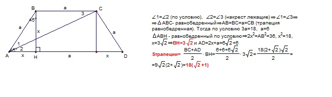 Острый угол равнобокой трапеции равен 45 градусов. Сумма длин ее боковых сторон и меньшего основания равна 18 см.Найти высоту и площадь трапеции если ее диагональ является биссектриссой угла при основании