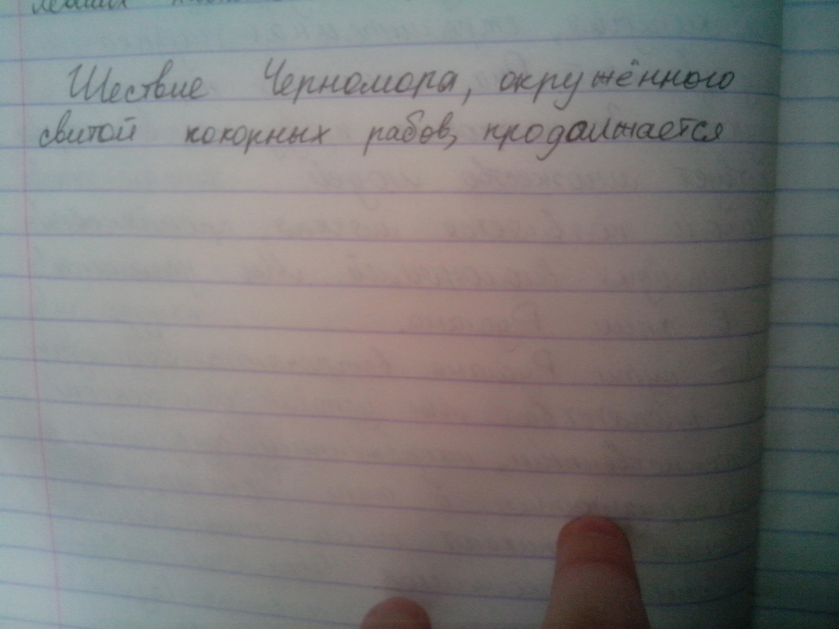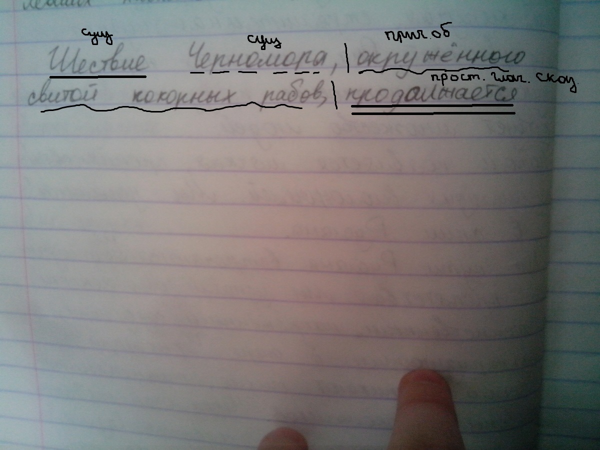 Шествие (сущ) Черномора(обстоятельство _._._._), |окруженного свитой покорных рабов| (Причастный оборот), продолжается (глагол, сказуемое)