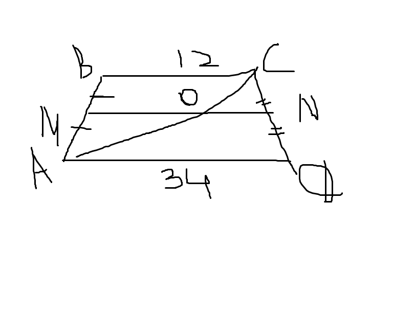 основания трапеции равны 12 и 34. найдите больший из отрезков, на которые делит среднюю линию этой трапеции одна из ее диагоналей