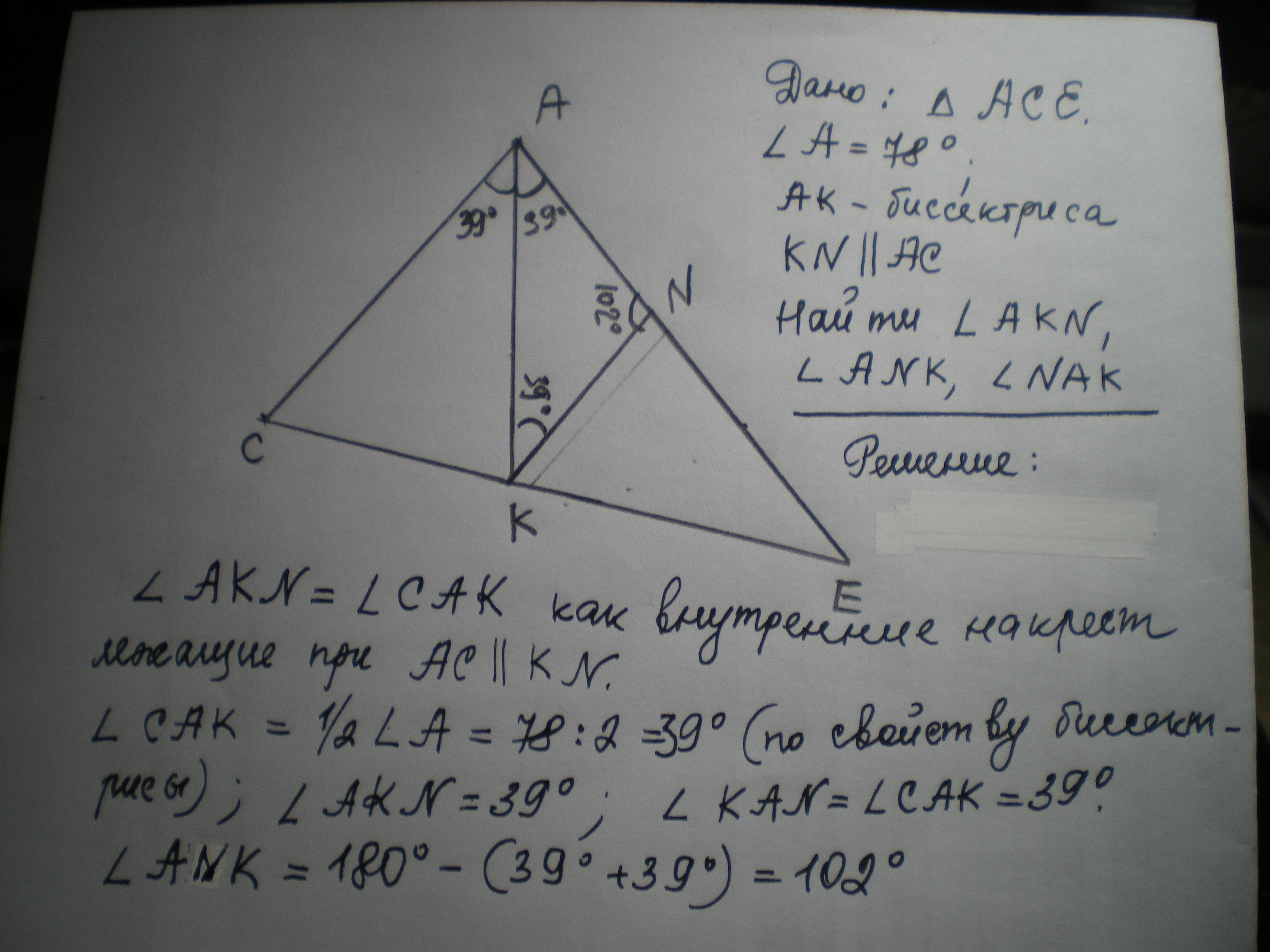 Отрезок АК-биссектриса треугольника САЕ. Через точку К проведена прямая,параллельная стороне СА и пересекающая сторону АЕ в точке N. Найдите углы треугольника АКN,если угол САЕ= 78 градусов