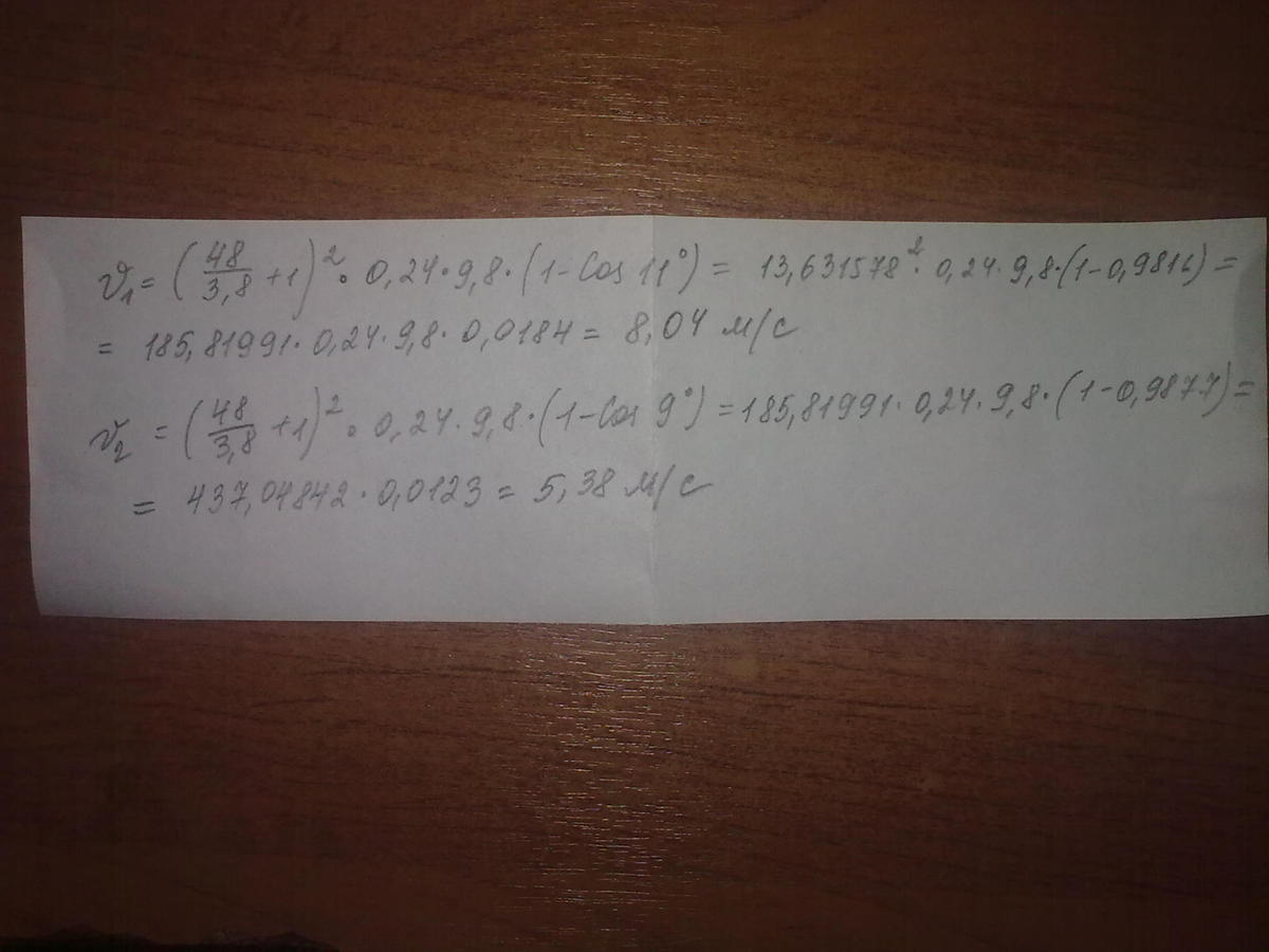 Определить скорость шарика с помощью баллистического маятника:масса маятника М=48г,масса шарика m=3.8г,длина нити подвеса l=240мм,ускорение свободного падения g=9.8,угол отклонения a=11град и a=9град вычислить по формуле V=(M/m+1)^2gl(1-cosa) ответ дать в м/с
