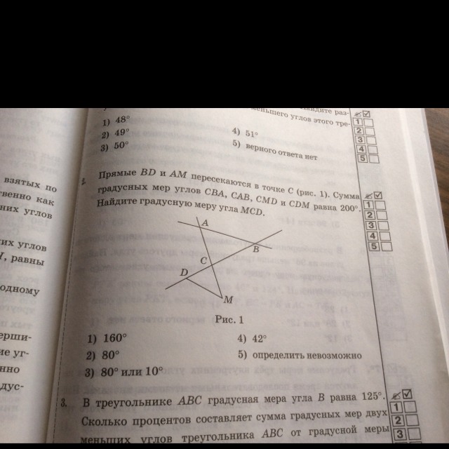 сумма углов этого треугольника 360 градусов, нас 2 угла оставшихся приходится 360-200=160.Углы эти вертикальные и равны, значит угол, который нужно найти равен 160/2=80.