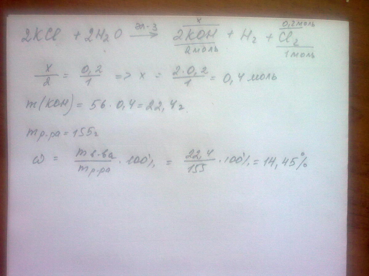 В результате электролиза водного раствора хлорида калия выделился хлор хим.кол-вом 0.200 моль и образовался гидроксид калия.масса раствора к моменту окончания электролиза составила 155 г.Определите массовую долю гидроксида калия в образовавшемся растворе.