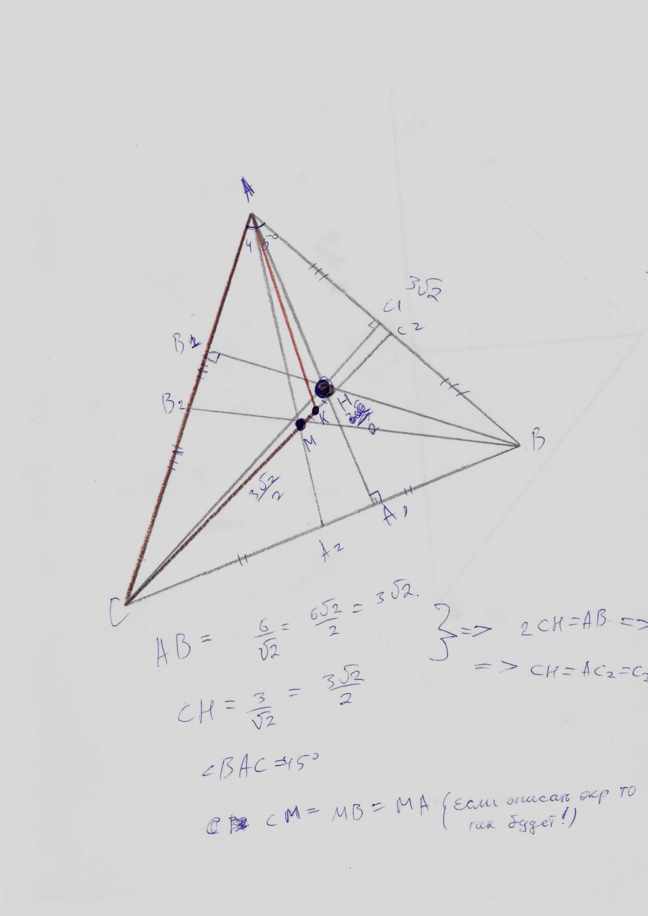Высоты треугольника ABC пересекаются в точке H. а медианы - в точке M. Точка K - середина отрезка MH. Найдите площадь треугольника AKC . если известно что AB= sqrt{2} СН=3 sqrt{2} угол BAC=45*
