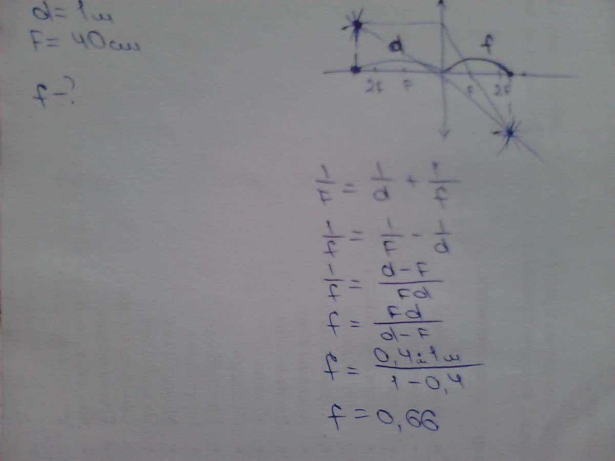 Светящая точка находится на расстоянии 1м от собирающей линзы.На каком расстоянии будет находиться её изображение,если фокусное расстояние линзы равно 40см?