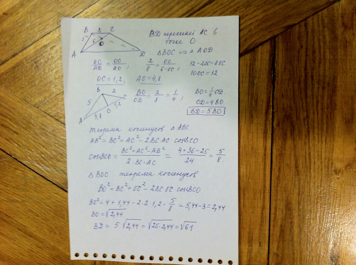 Основания трапеции ВС и AD соответственно равны 2 и 8 см. Сторона АВ=5, диагональ АС=6.Найти диагональ BD/