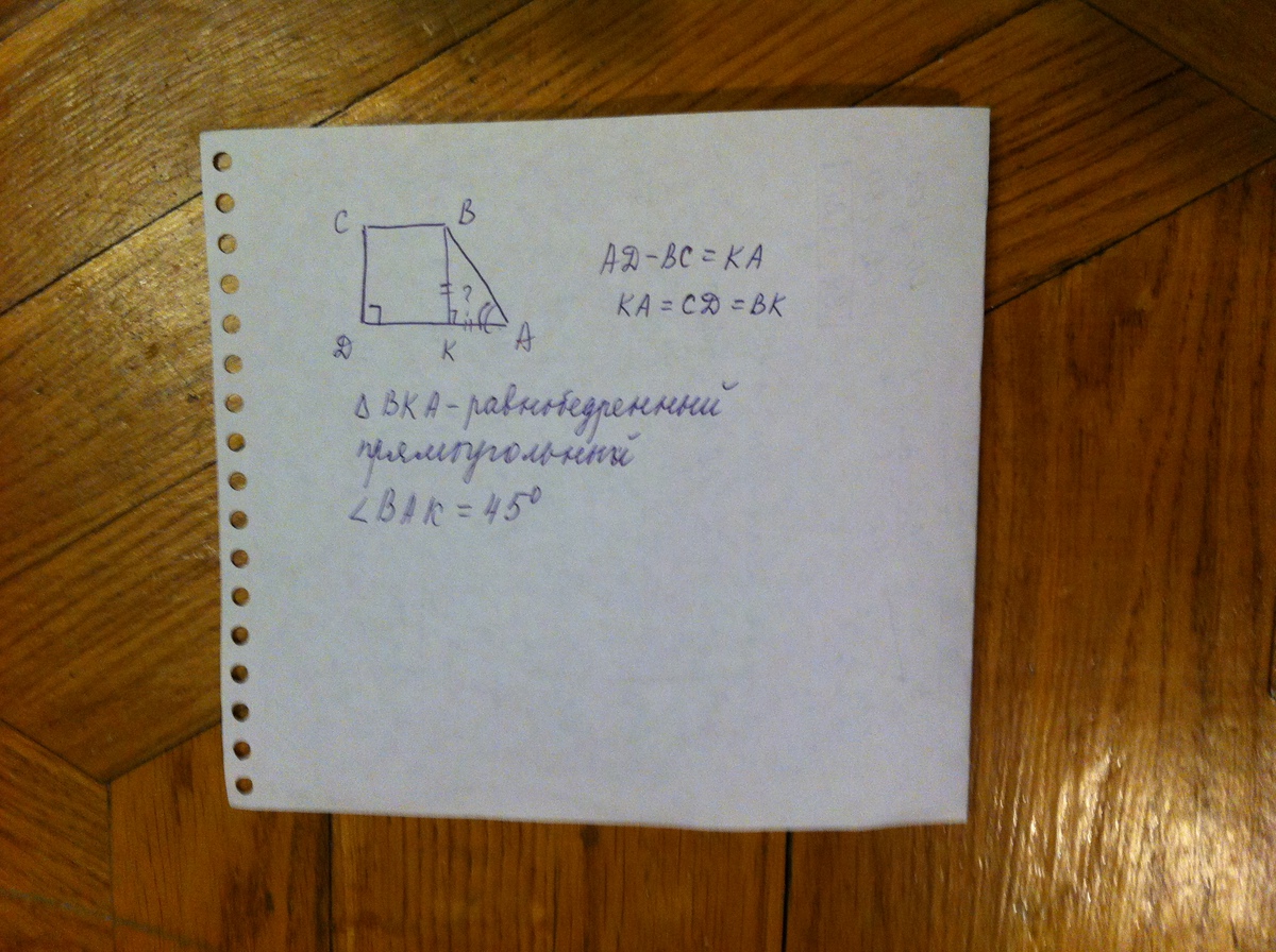В прямоугольной трапеции ABCD разность оснований AD и BC равна меньшей стороне CD.Найдите величину угла BAD