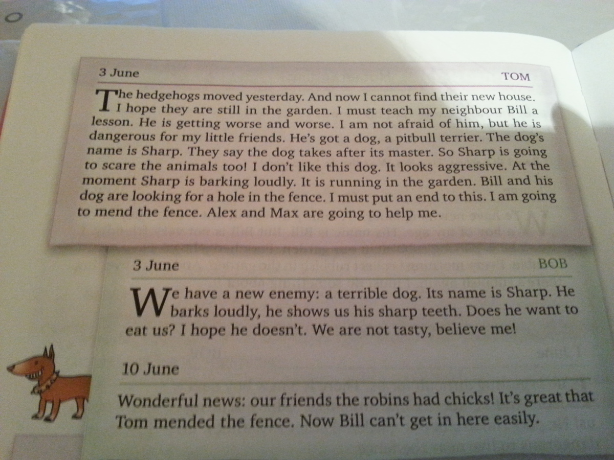 Ежики переехали вчера. И теперь я не могу найти их новый дом. Надеюсь они все еще в саду. Я должен преподать Билу урок. Он становится все хуже и хуже. Я не боюсь его, но он опасен для моих маленьких друзей. У него есть собака, питбуль ретривер. Его зовут Шарп. Говорят,что собаки похожи на своих хозяев. Так что Шарп собирается пугать зверей тоже. Мне не нравится эта собака. Она выглядит агрессивно. Сейчас собака громко лает. идет дождь. Бил с его псом обыскивают весь забор. я должен положить этому конец. я собираюсь починить забор. Алекс и Макс помогут мне в этом.
