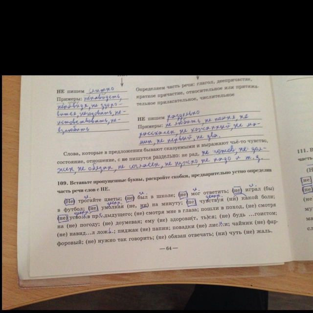 Не трогайте цветы(глагол), не был в школе(глагол), не мог ответить(глагол), не играл бы в футбол(глагол), не умолкая ни на минуту(деепричастие), не чувствуя никакой боли(деепричастие), не усвоив предыдущего(деепричастие), не смотря мне в глаза(деепричастие); пошли в поход, несмотря(предлог) на непогоду(существительное);недоумевая(деепричастие),ему нездоровится(предикативное наречие),не будь эгоистом(глагол),ненавидел ложь(глагол), пиджак непапин(прилагательное), повадки нелисьи(прилагательное), чайник нефарфоровый(прилагательное),не нужно так говорить(наречие), не обязан отвечать(краткое причастие), ничуть(наречие) не жаль(существительное).