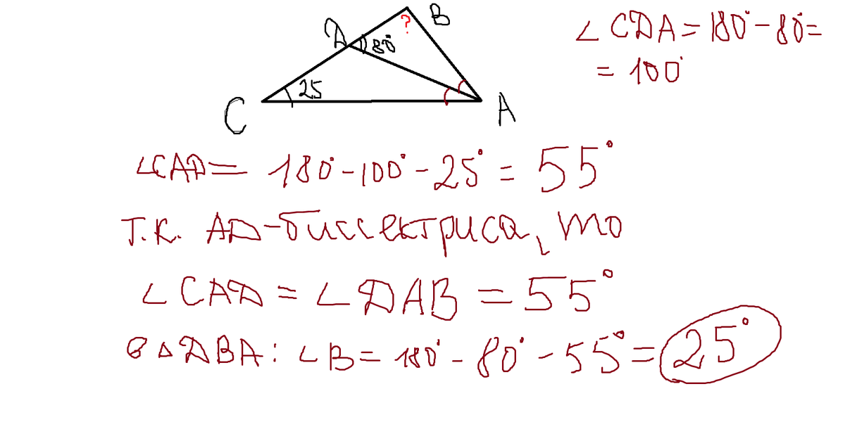 В треугольнике АВС угол С = 25 градусов, АD - биссектриса угла А, угол АDВ = 80 градусов. Найдите угол В.