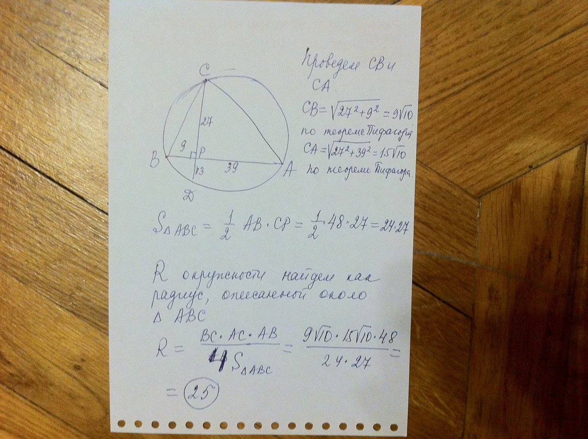 В окружности провели хорды AB и CD, которые перпендикулярны друг другу и пересекаются в точке P так, что AP =39,BP =9,CP =13,DP=27. Найдите радиус окружности.