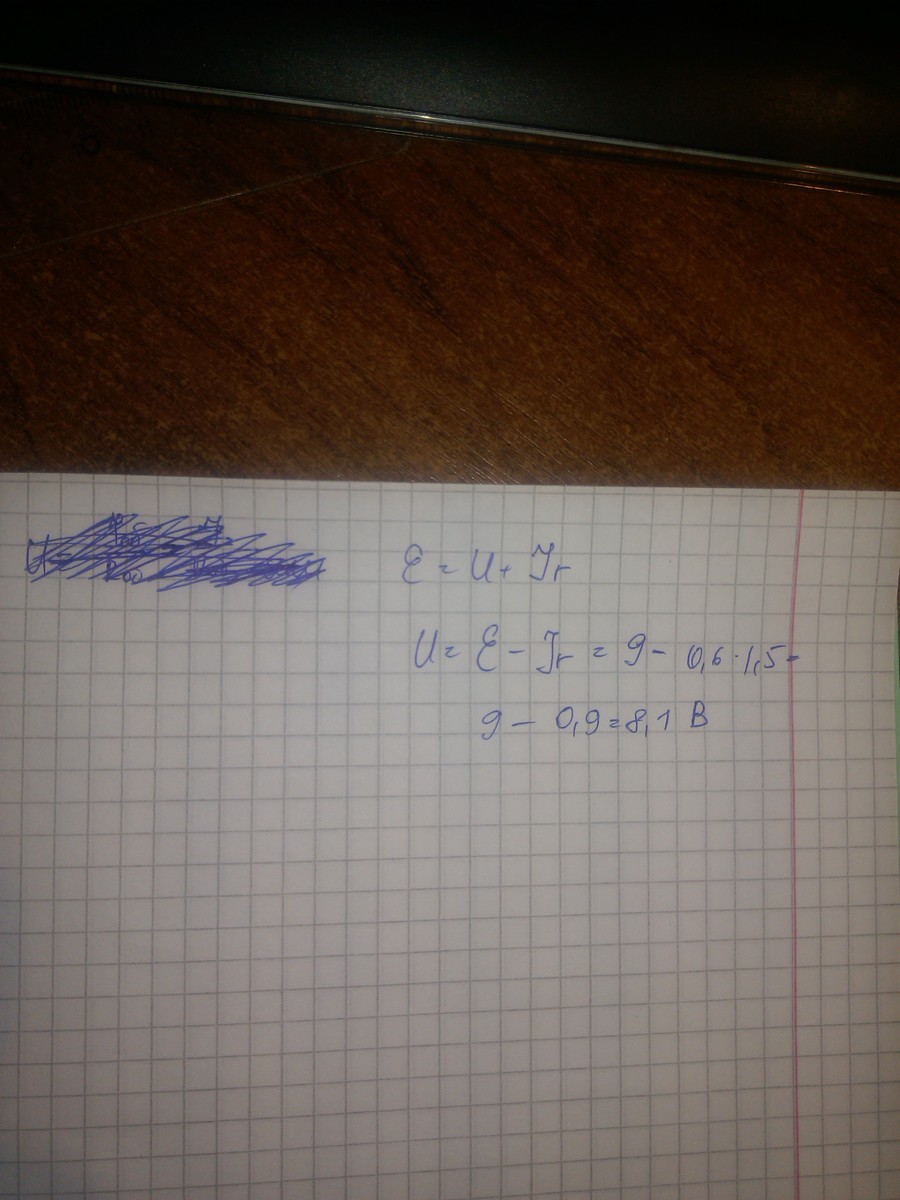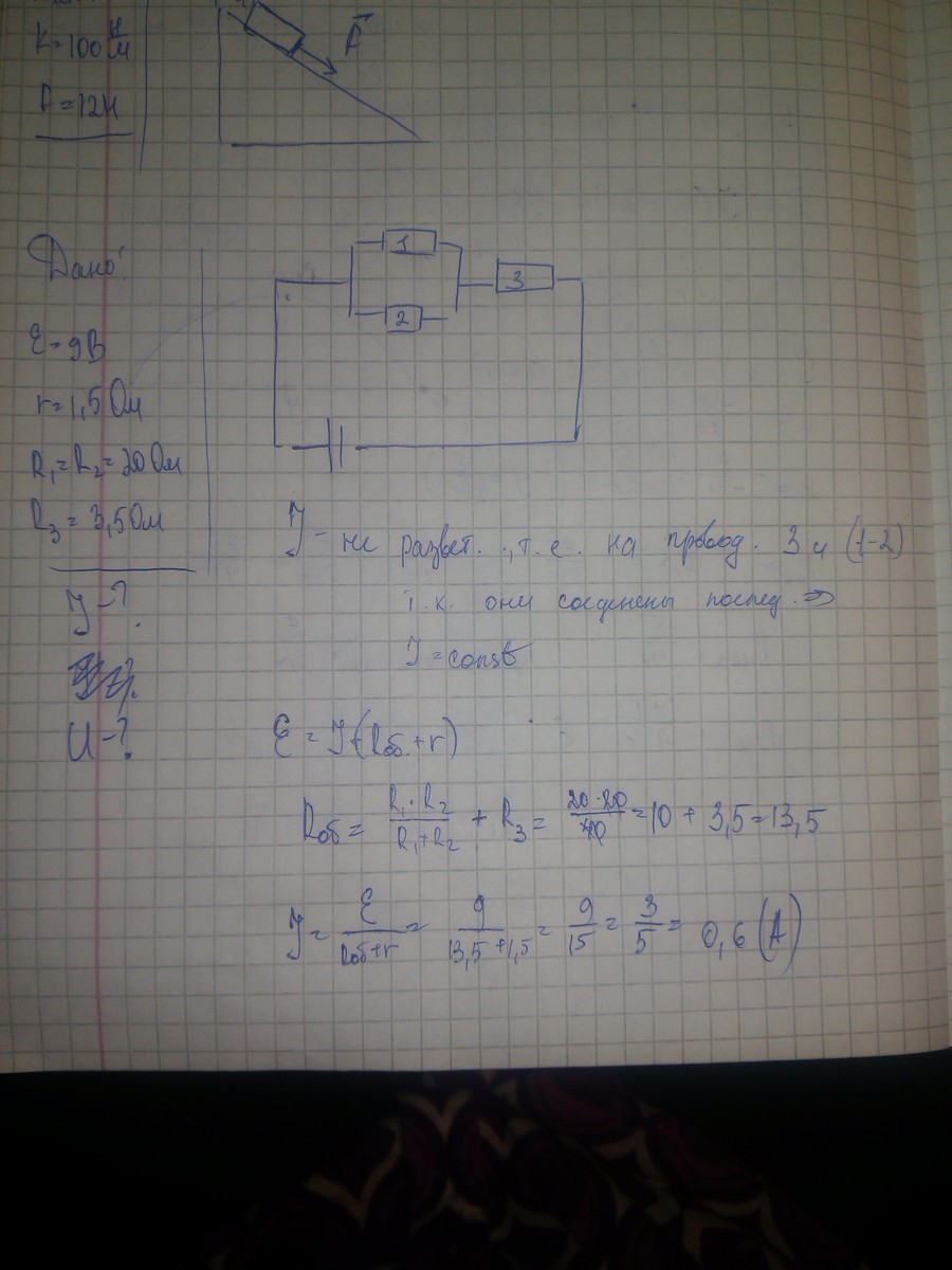 к источнику тока с ЭДС 9 В и внутренним сопротивлением 1,5 Ом присоединена состоящая из двух проводников по 20 Ом каждый, соединенных между собой параллельно, и третьего проводника сопротивления 3,5 Ом, присоединенного последовательно к двум первым. Чему равна сила тока в неразветленной части и напряжение на концах цепи?