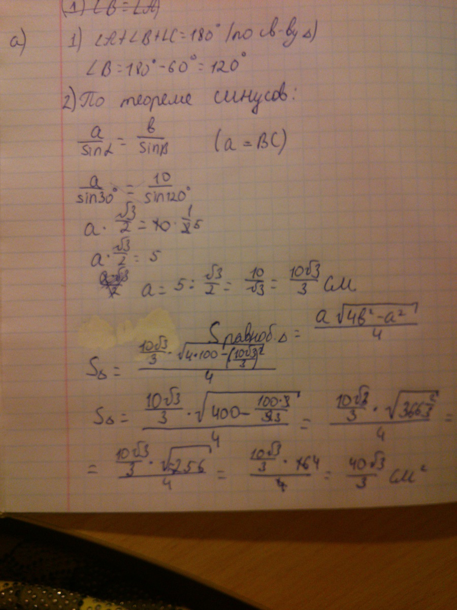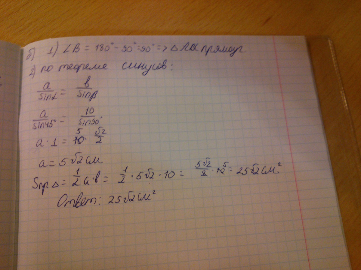 Найдите площадь равнобедренного треугольника по основанию 10 см и углу при основании, равному а) 30; б) 45.
