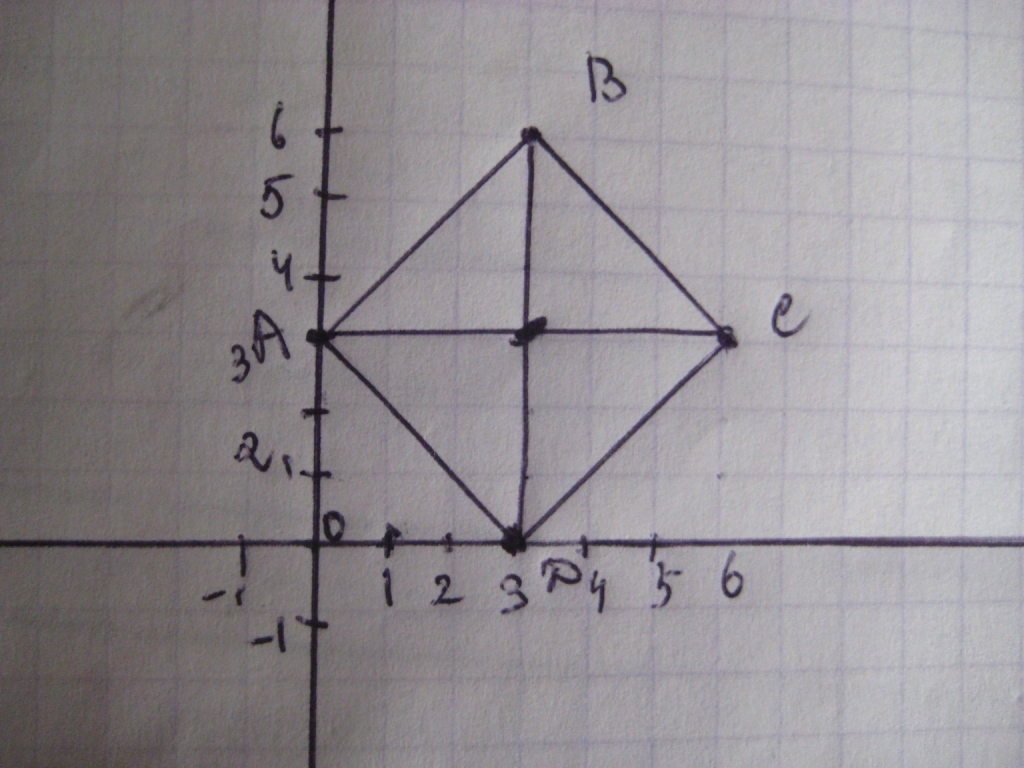 Постройте квадрат АВСD по координатам его вершин А(0;3), В(3;6), С(6;3) и D(3;0). Проведите отрезки АС и ВD. Найдите координаты точки, в которой пересекаются эти отрезки.
