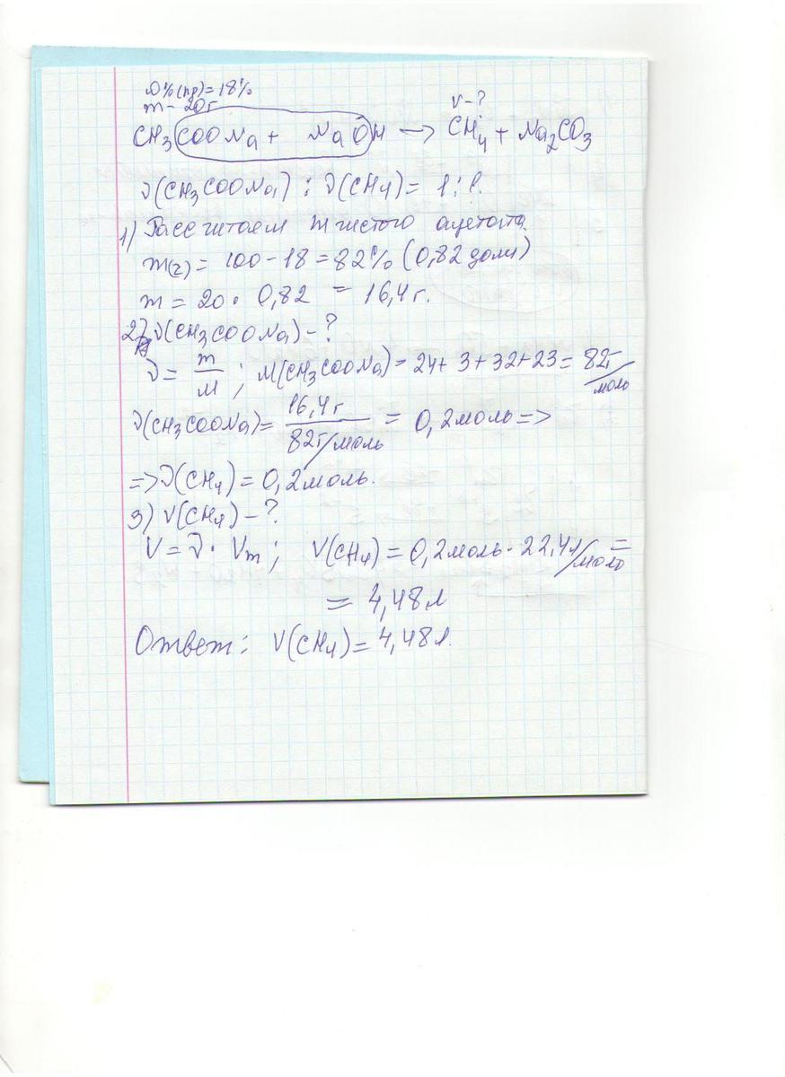 какой объем метана можно получить при сплавлении с избытком гидроксида натрия ацетата натрия массой 20 г, содержащего посторонние примеси,массовая доля которых составляет 18%?