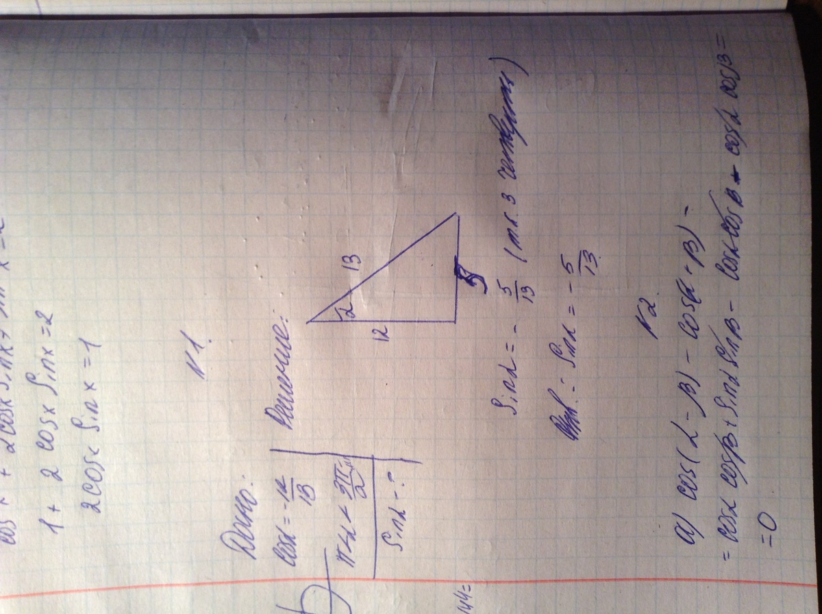 1. Вычислите: sin (a), если cos (a)= -12/13 и П<(a)<3/2П
