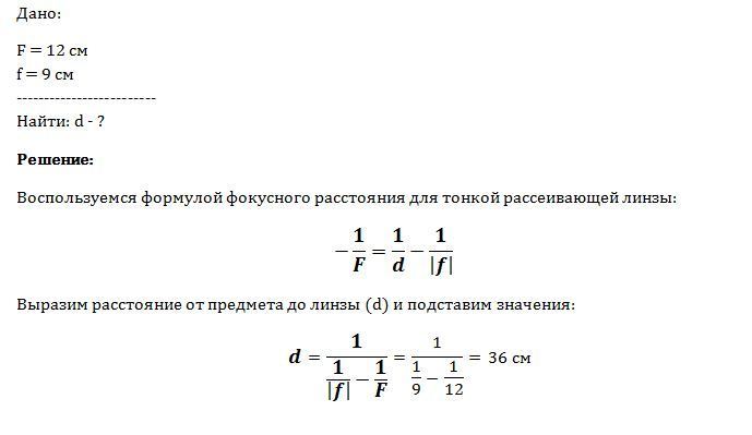 Главное фокусное расстояние рассеивающей линзы равна 12 см.Изображение предмета находится на расстоянии 9 см от линзы. Чему равно расстаяние от предмета до линзы?
