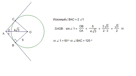 К окружности с центром в точке О и радиусом 6 см из точки А проведены касательные. Найдите угол между этими касательными, если ОА=4корня их трёх см