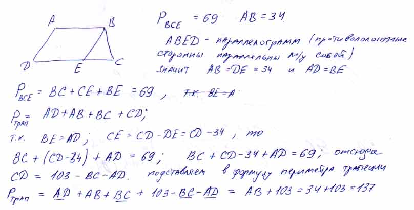 Прямая, проведённая параллельно боковой стороне трапеции через конец меньшего основания, равного 34, отсекает треугольник, периметр которого равен 69. Нужно найти периметр трапеции