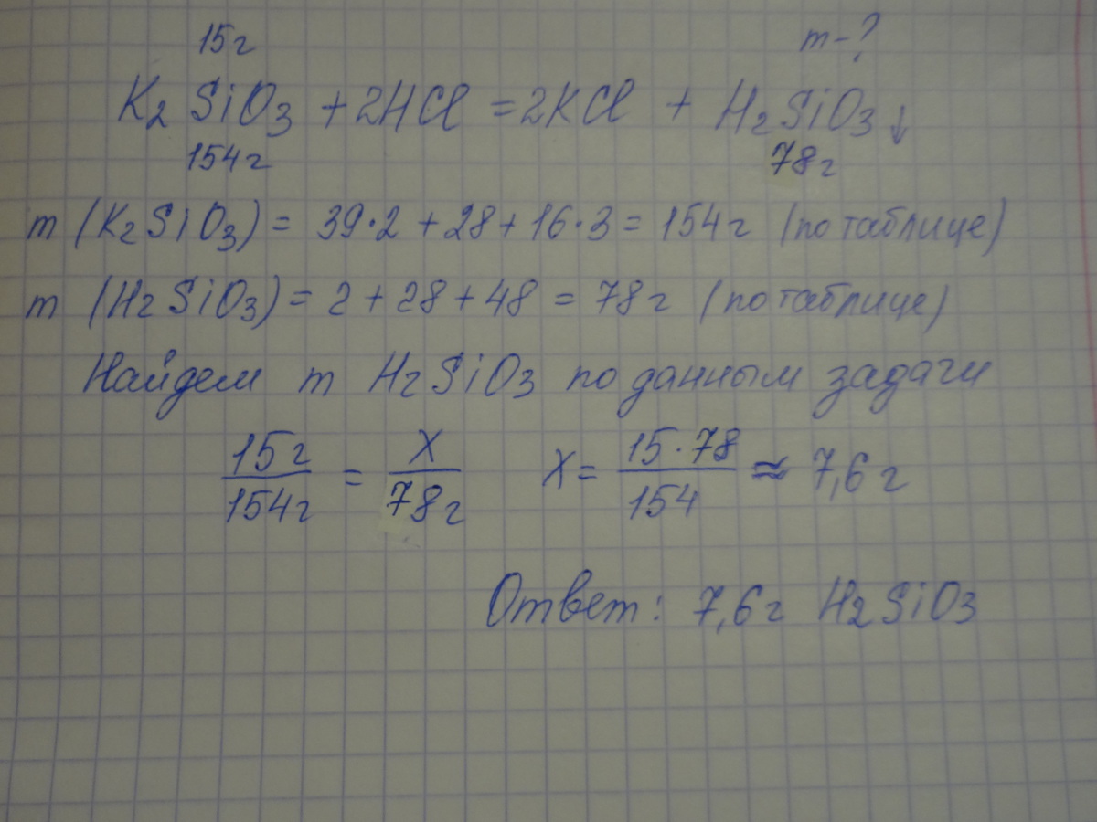 1)осадок какой массы образуется при добавлении к раствору, содержащему K2SiO3 массой 15г, избытка соляной кислоты?