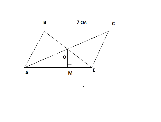Сторона параллелограмма равна 7 см, а расстояние от точки пересечения диагоналей параллелограмма до этой стороны равно 2 си. Найдите площадь параллелограмма.