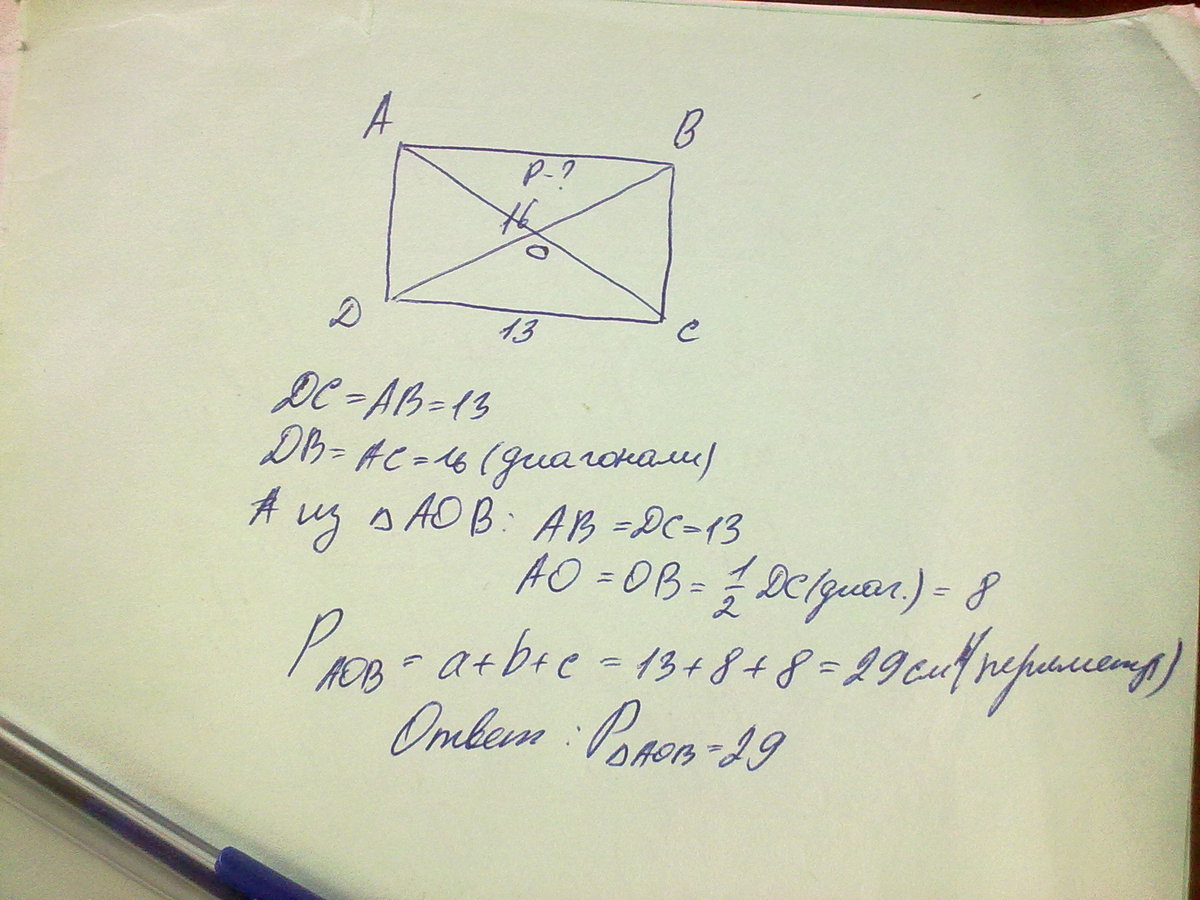 Дано: прямоугольник ABCD BD=16 см CD=13см.О-точка пересечения диагоналей.Найти периметр треугольника AOB