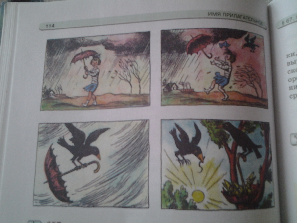 Стояло серое и пасмурное утро, но Алёнке нужно было проведать бабушку. Пока Алёнка шла поднялся сильный ветер и пошёл дождь. Шквал ветра вырвал зонт из рук девочки и зонт полетел , подгоняемый ветром. Следом летел ворон и увидев летящий зонт бросился за ним. Подхватив зонт клювом , он принёс его на дерево, где гнездилась вся его семья. Высоко в ветвях они пристроили зонт так, что он служил им отличным новым гнездом. Воронята сразу перебрались в новое жильё и обосновались в нём. Вот так новоселье!