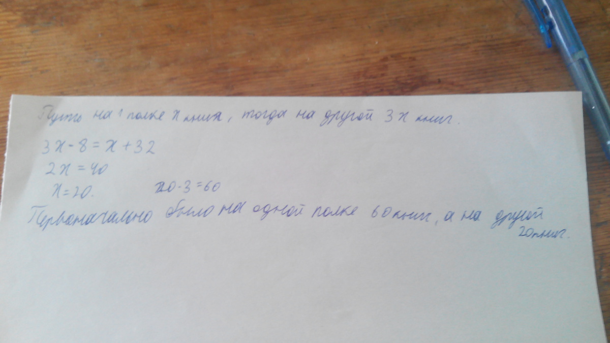 На одной полке было в 3 раза больше книг чем в другой. Когда с одной полки сняли 8 книг а на другую положили 32 книги, то на полках стало книг ровну.Сколько было кн на каждой полкпервоначльно. 6класс зача номер 1346