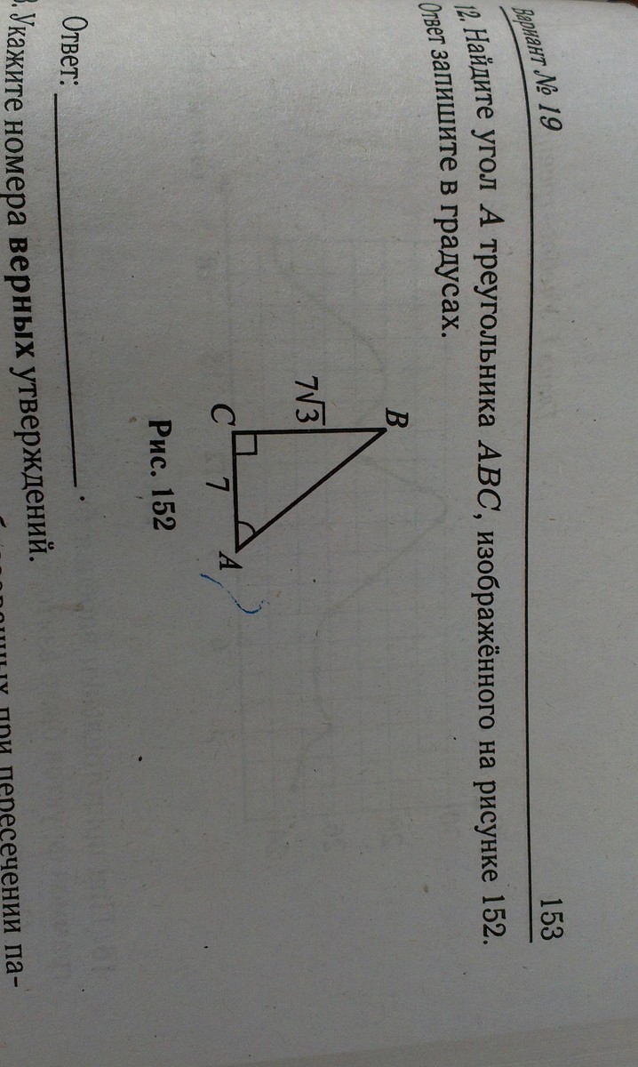 найдите угол А треугольника АВС ,изображенного на рисунке 152.ответ запишите в градусах