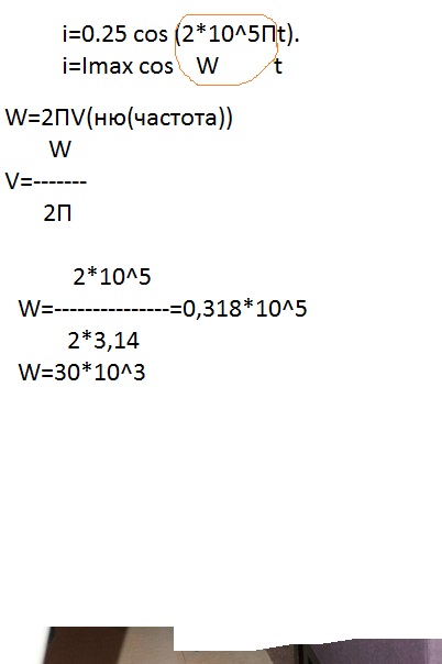 Сила тока в колебательном контуре радиопередатчика, задающая несущую частоту изменяется в соответствии с уравнением i=0.25cos(2*10^5Пt). На какой частоте работает передатчик?