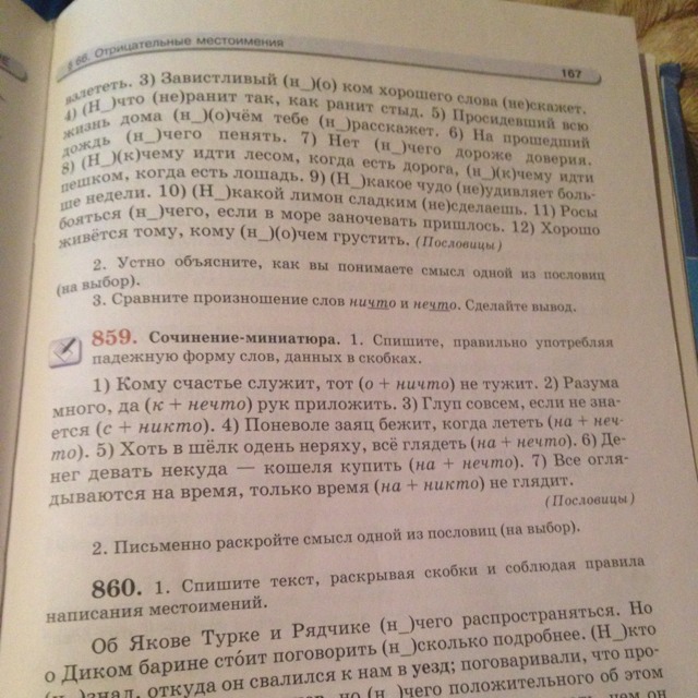 Кому счастье служит, тот ни о чем не тужит. Разума много, да не к чему рук приложить. Глуп совсем, если не знается ни с кем. Поневоле заяц бежит, когда лететь не на чем. Хоть в шелк одень неряху, все глядеть не на что. Денег девать некуда - кошеля купить не на что. Все оглядываются на время, только время ни на кого не глядит.