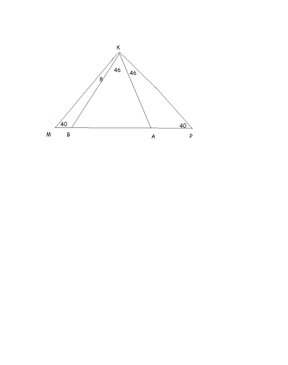 пол угла РКВ =46 гр, тогда он весь равен 92 градусам. Угол МКР равен 100 гр(180-40-40) следовательно МКВ равен 8 гр. Искомый угол=МКВ+ВКА=46+8=54