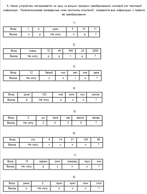 Некое устройство настраивается на одну из восьми программ преобразования числовой или текстовой информации. Проанализировав приведенные ниже протоколы испытаний, определите вид информации и правило её преобразования.