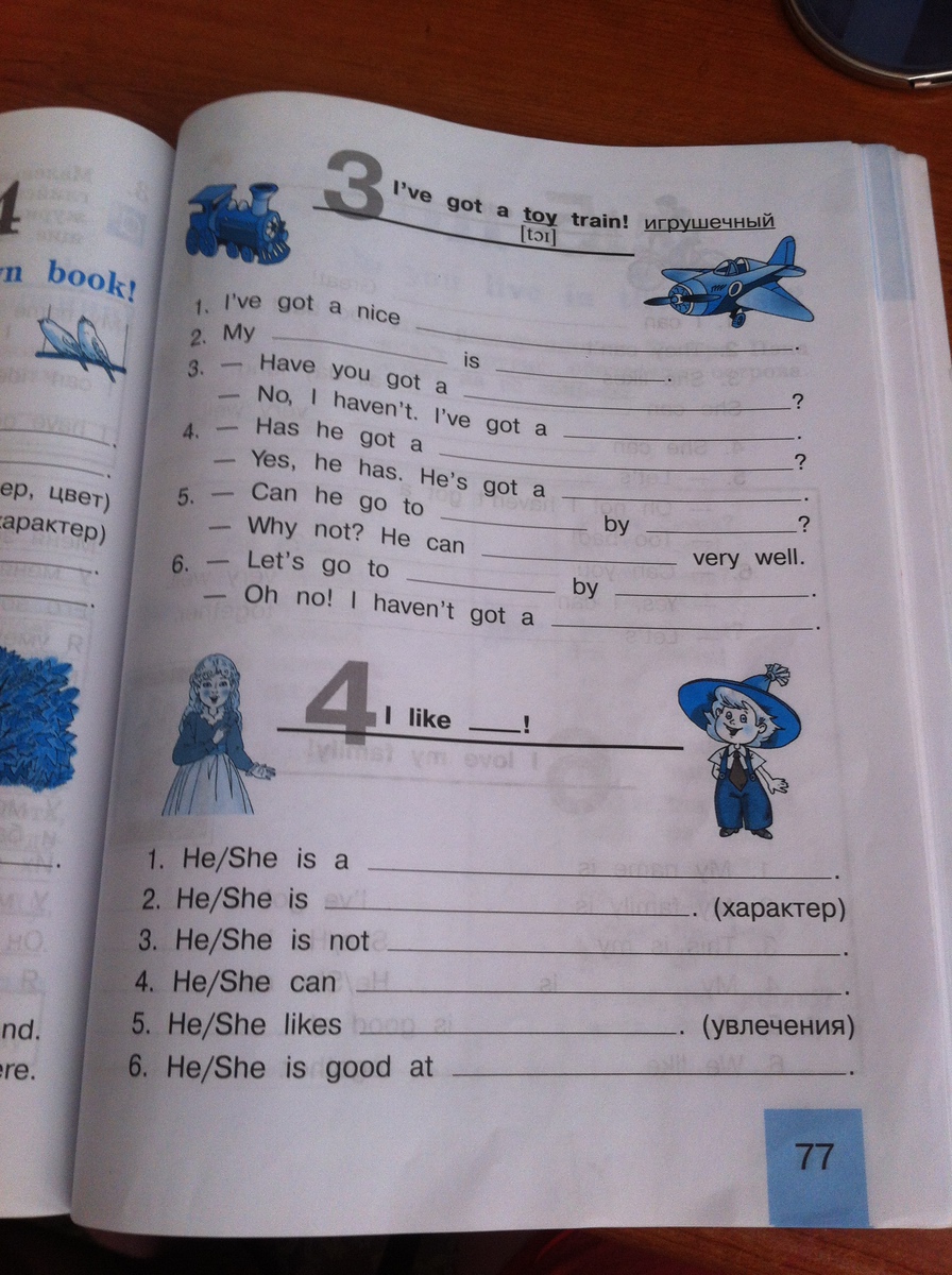 1. I've got a nice toy. 2. My toy is a train. 3. Have you got a train ? 4. i've got a plane. 5. Has he got a toy ? 6. He's got a car-toy. 7. Can he go to school by bike ? 8. He can ride by bike very vell. 9. Let's go to the cinema by car. 10. I haven't a car.